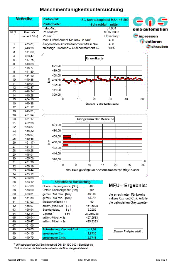 Gerne führen wir an Ihrem System eine MFU durch. Zum Einsatz kommen Messwerkzeuge, die an das Normal der PTB angebunden sind. Der Schraubfallsimulator entspricht der ISO 5393 / Annex B.